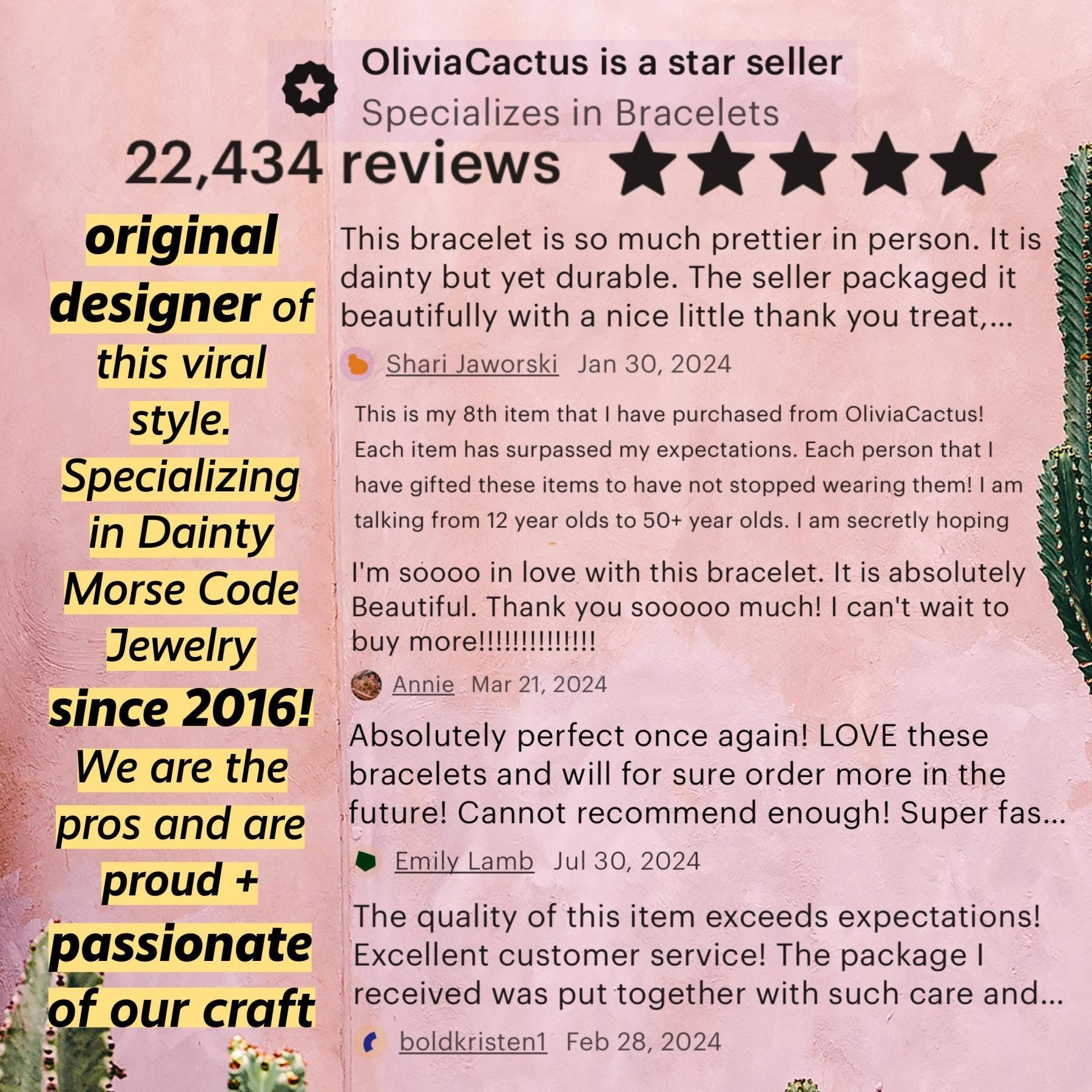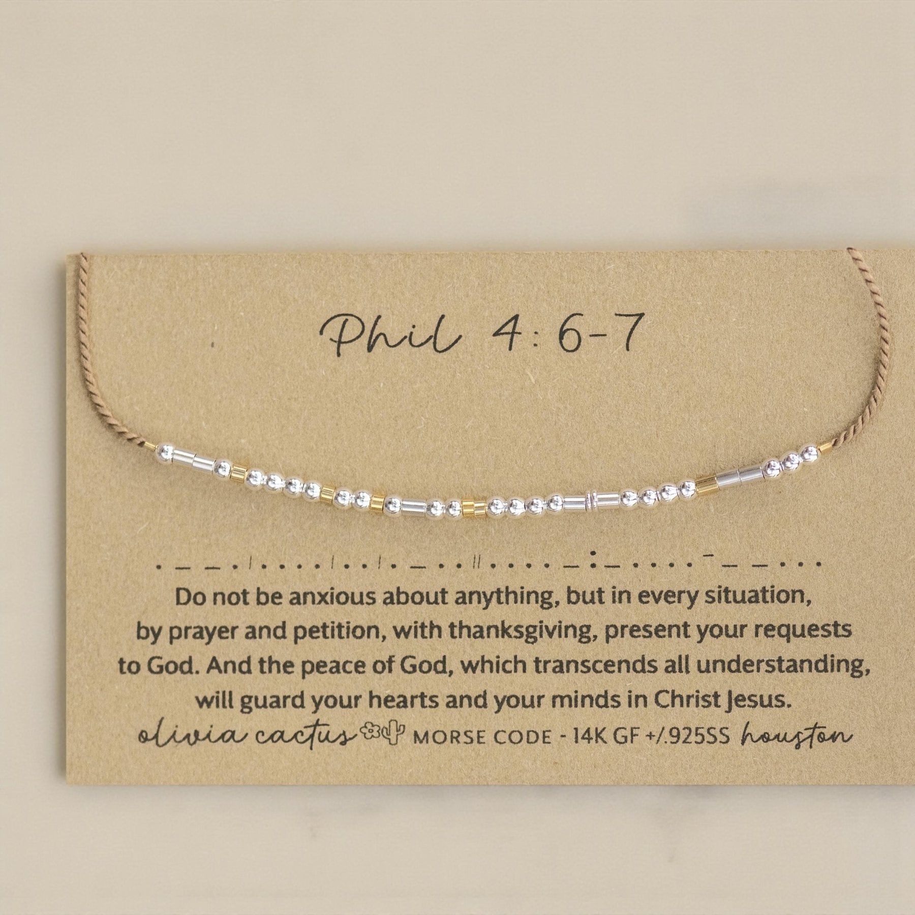 This adjustable bracelet encodes the message Do Not Be Anxious in delicate Morse code beading. Choose the default Philippians 4:6 or personalize it with any scripture, word, or short phrase. Subtle, minimalist and gift ready, this is a daily reminder of peace and confidence rooted in faith.