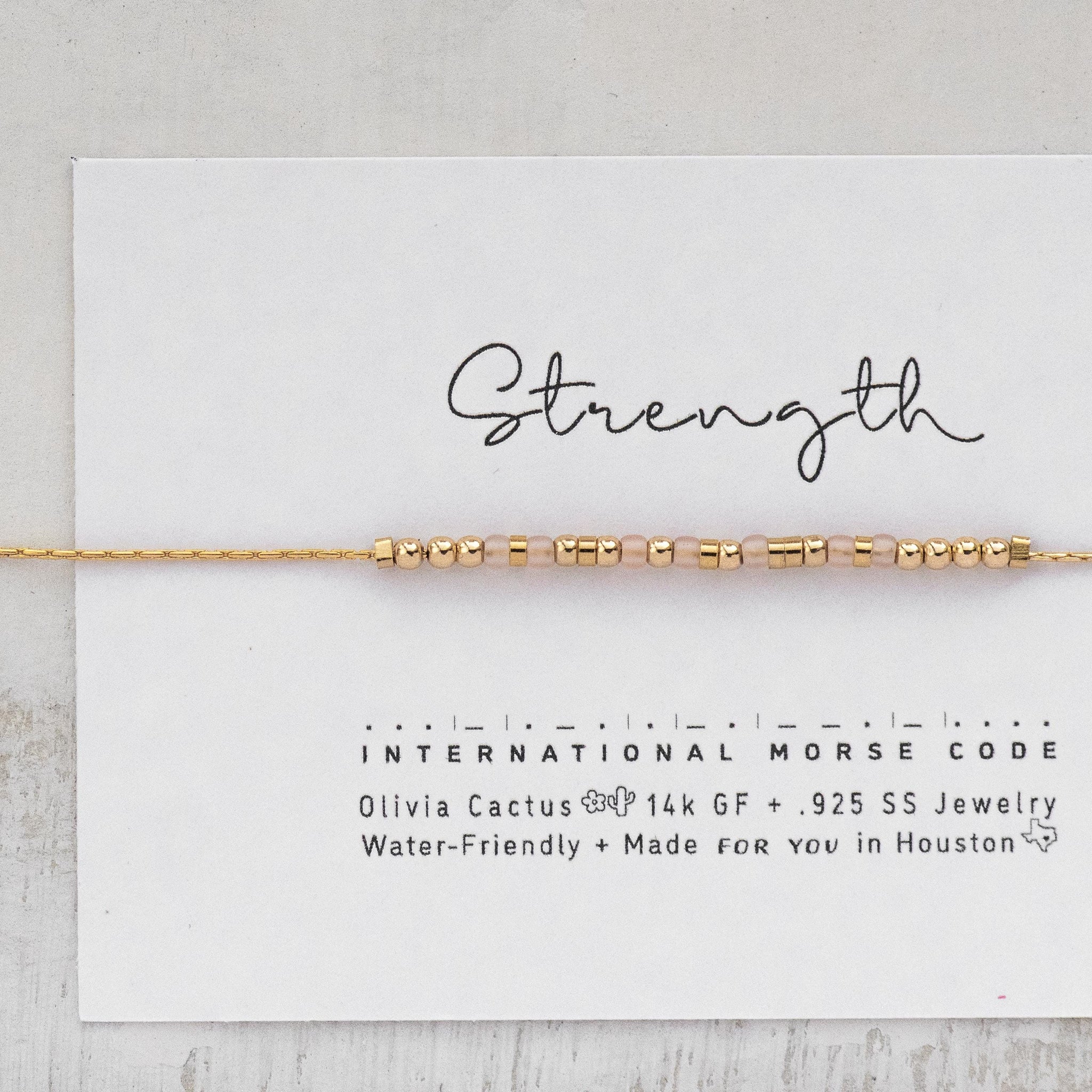 Spell Strength or Any Custom Word in Morse Code and We will print and match the word with a personalized card all within a box with a bow ready to gift or receive directly as a gift. Beads are a sweet blush/ clear peachy color.