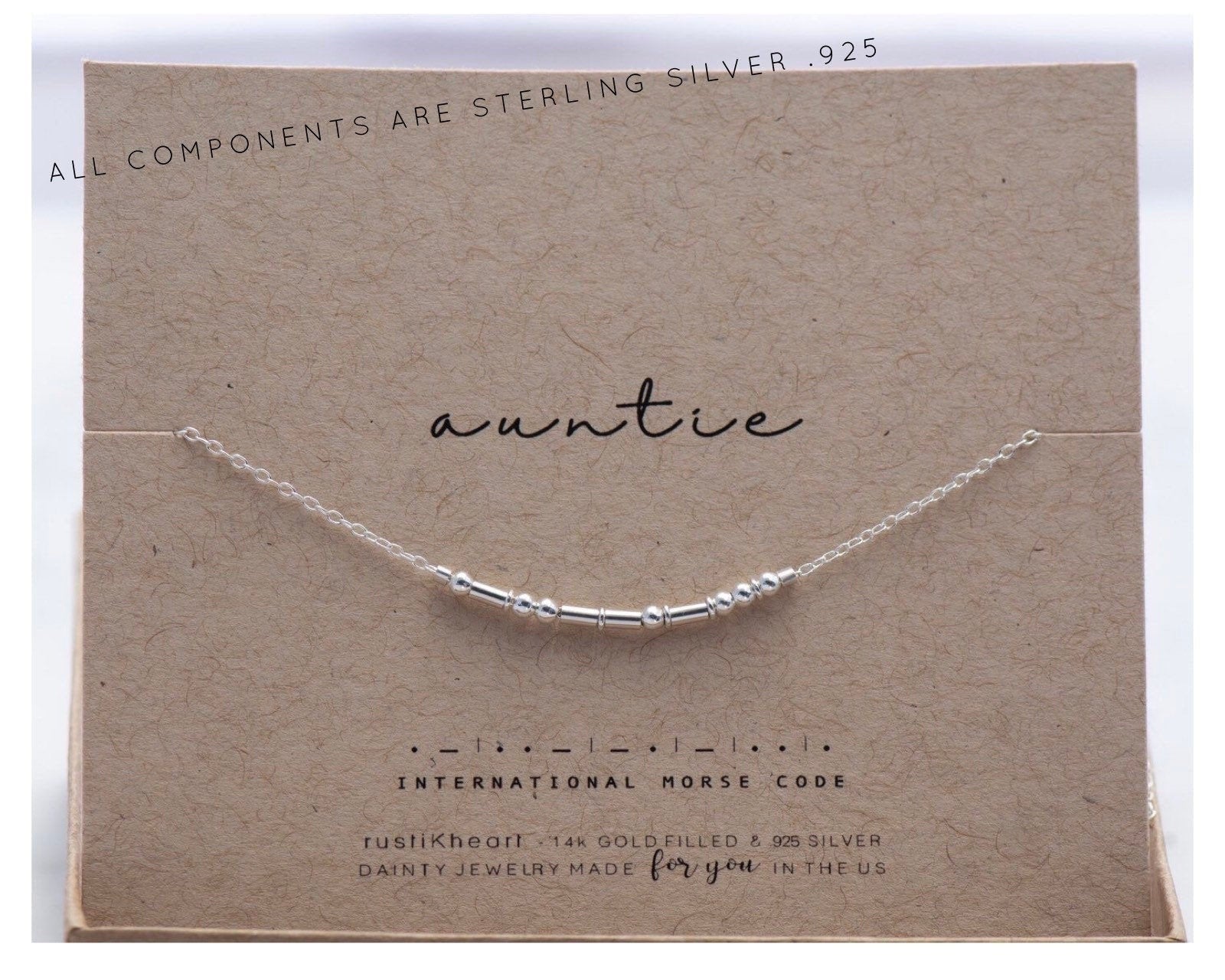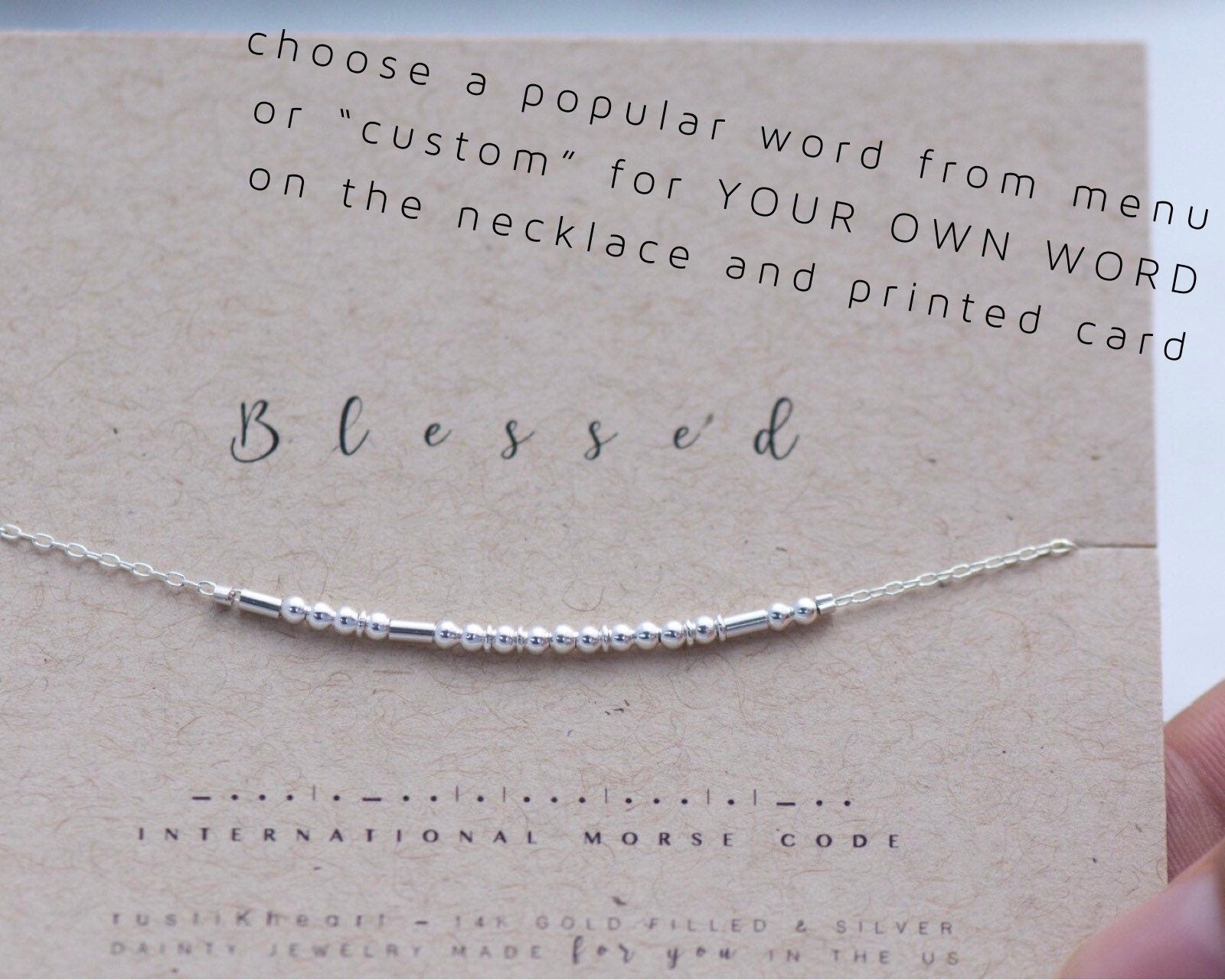 Delicate and elegant yet resilient, our Sterling Silver Morse Code Necklace features shimmering beads and tiny spacer hoops for easy decoding. Every component, including the clasps, is crafted from Sterling Silver. Personalize it by selecting a word or phrase, and we’ll create a custom card as well. Note: Numbers count as two letters per digit. Each necklace arrives in a charming gift box with a bow, ready to present! You can also upgrade to premium gift wrapping at checkout and include a personalized message. Explore more designs in all Sterling, gold, or rose gold. Perfect for personalized gifts, celebrating a beloved aunt, or sharing with friends.